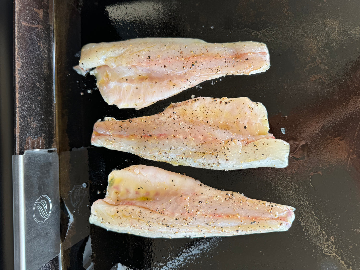 Fresh, perfectly pan fried sea bass fillets served with a side of seasonal vegetables.